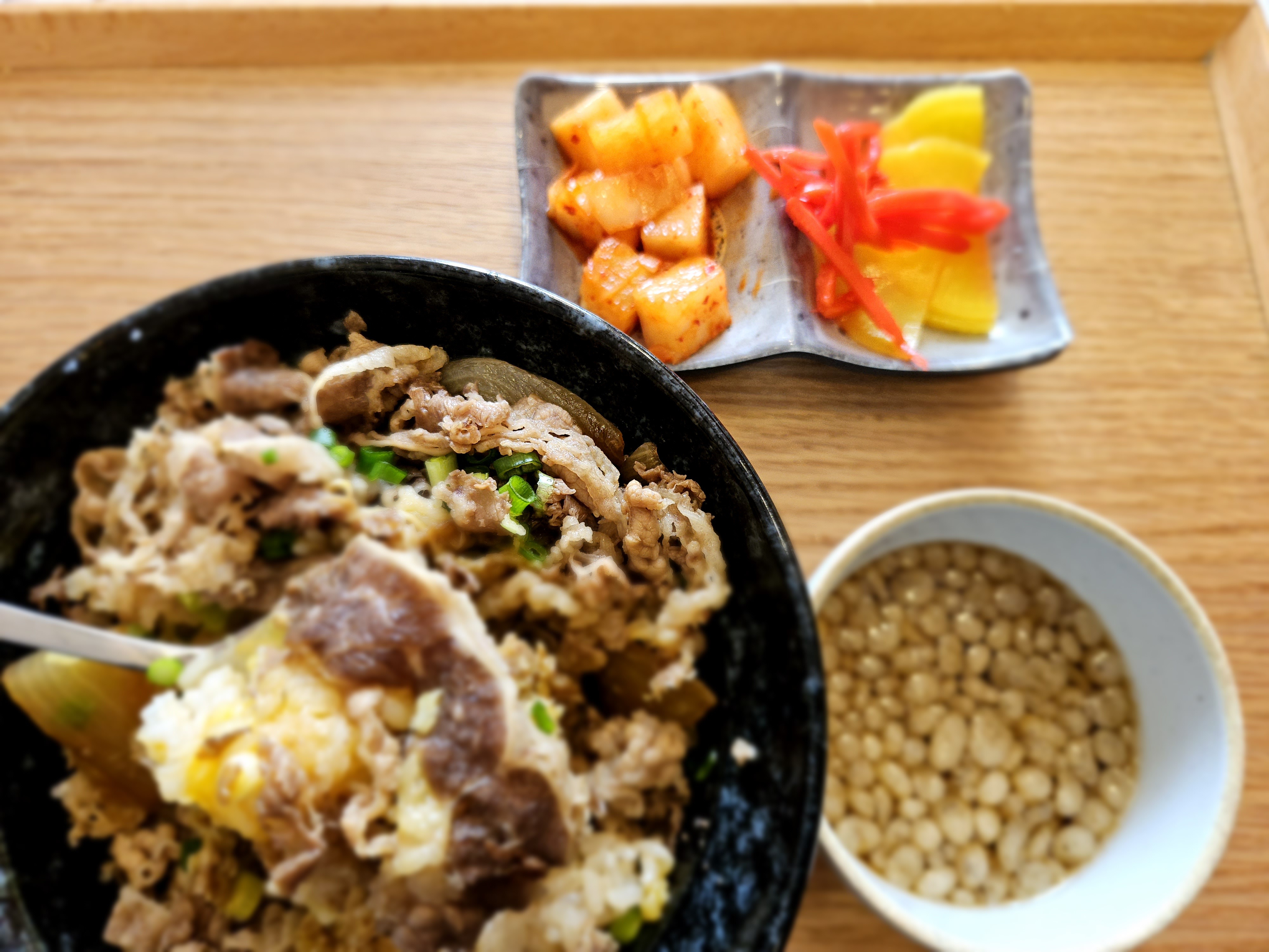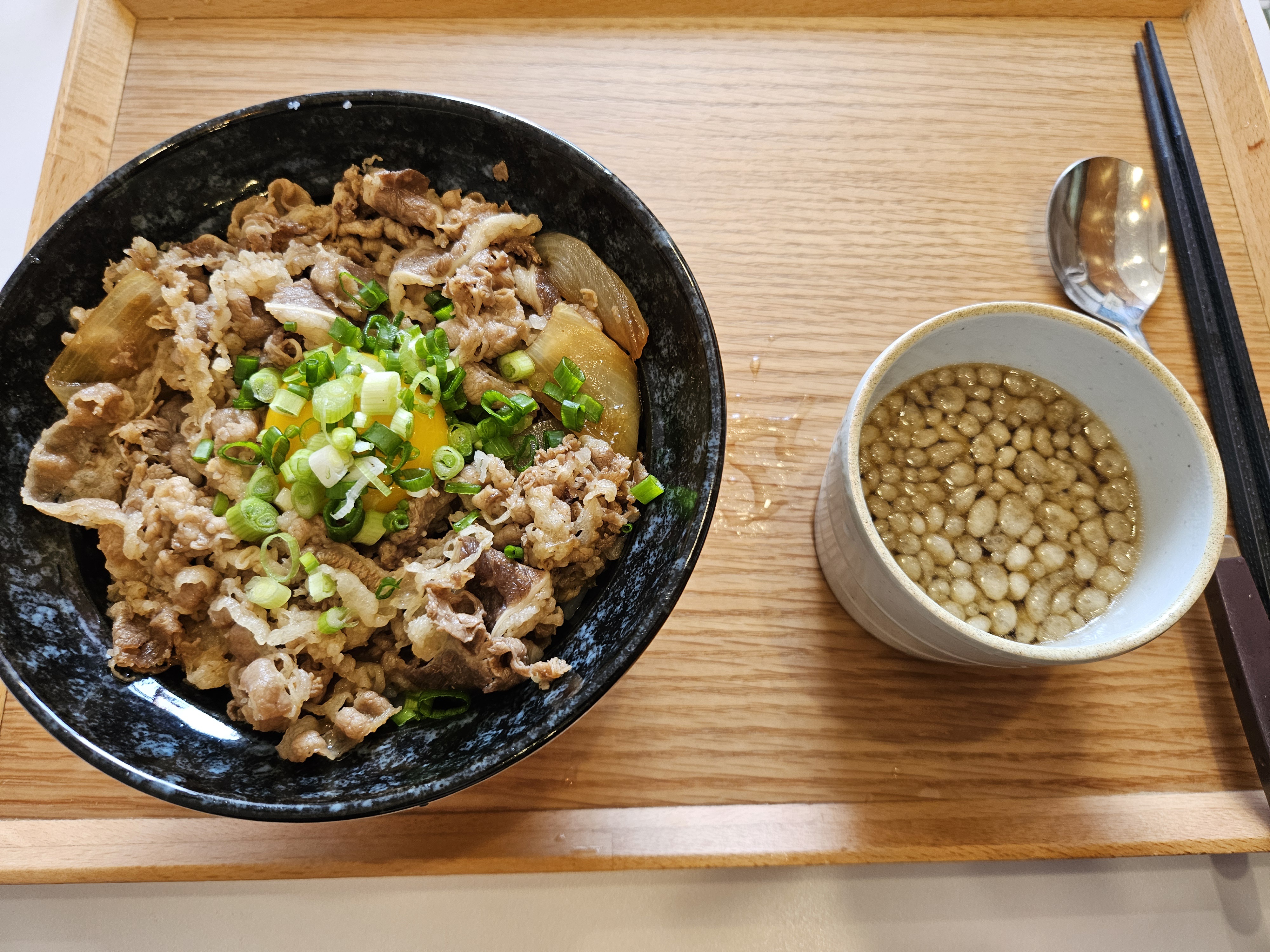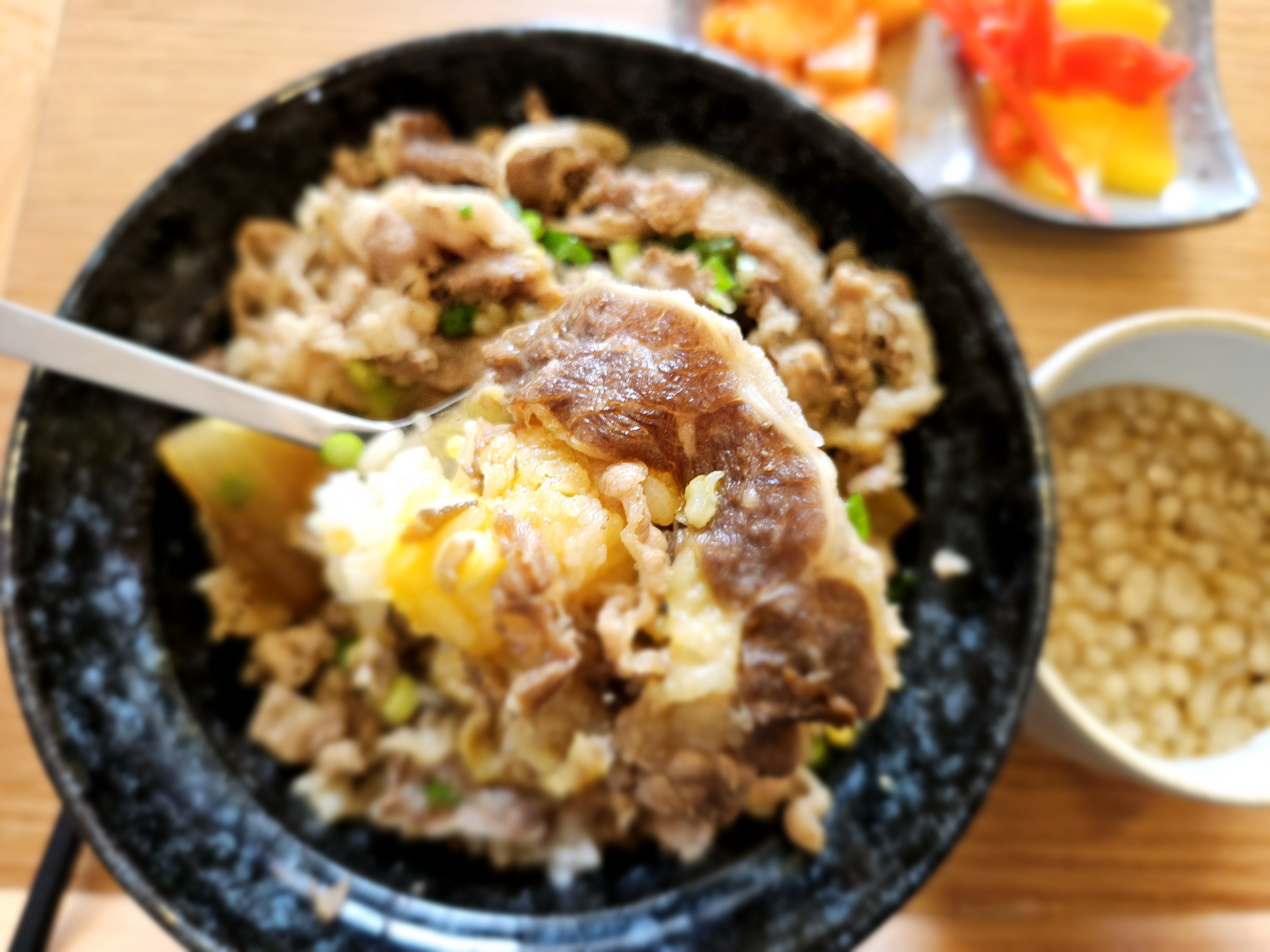 주문 후 약 5분 이내에 음식이 나왔고, 규동 위에 반숙 계란 하나가 딱 올라가 있습니다. 고기의 간이 딱 좋고 밥과의 조화도 뛰어나네요. 비벼 먹을수록 고소함과 단짠의 조화가 입안에 퍼집니다. 부담 없이 즐기기 좋은 한 그릇이었습니다.