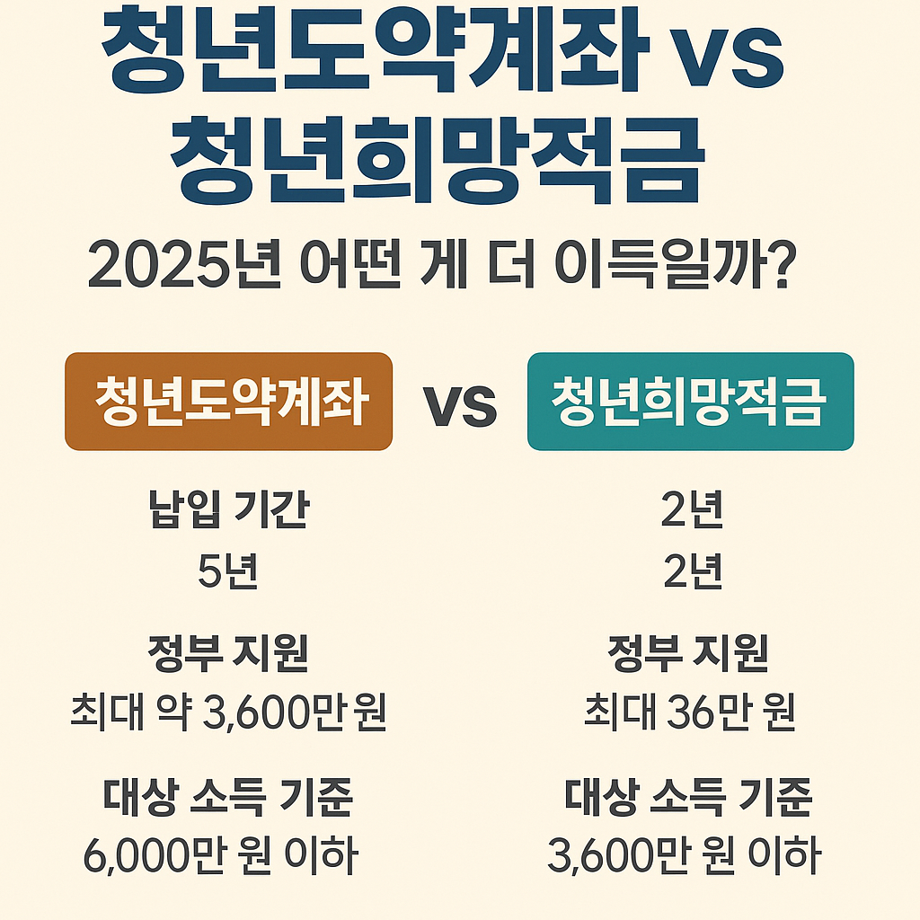두 상품 모두 정부 지원 + 고금리 혜택을 제공하지만, 지원 대상, 혜택, 만기 수령액 등에서 큰 차이가 있습니다.
